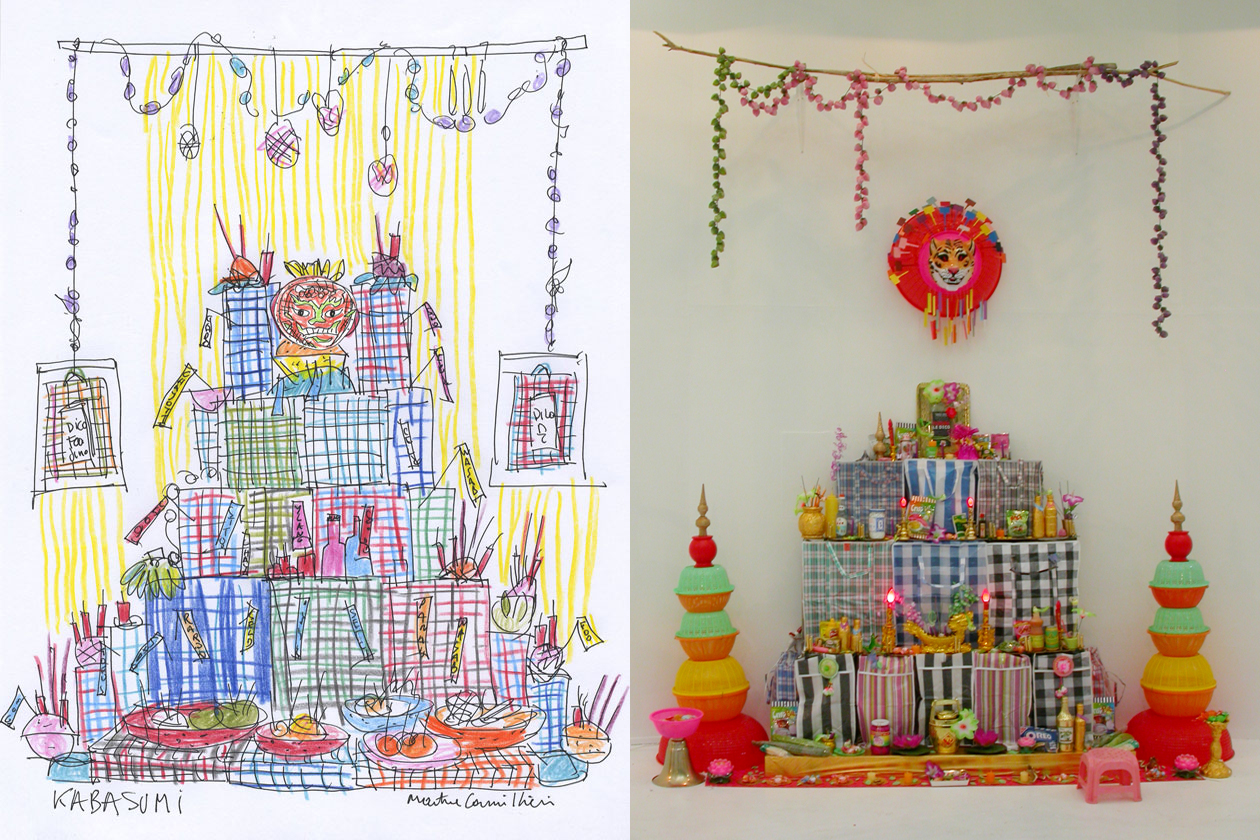 Cet autel est bâti avec des cabas basiques écossais sur les quels sont posés (en réel ou images) des Ingrédients (huile d'ylang-ylang, sucre japonais, pois wasabi, sauces coste, chips de betteraves ou de panais...), quasiment introuvables dans une autre province que l'IDF. Des étiquettes sont plantées partout comme des suppliques, elles portent des noms de produits inconnus. Des cierges consumés, des bougies vacillantes et de l'encens offrande témoignent de l'imploration à savoir... Heureusement sur l'autel est déposée la solution, un kit de course de notre époque : un cabas avec son dictionnaire (le Dico du Fooding) pour toutes traductions, vocabulaire, adresse, site internet, numéros verts !